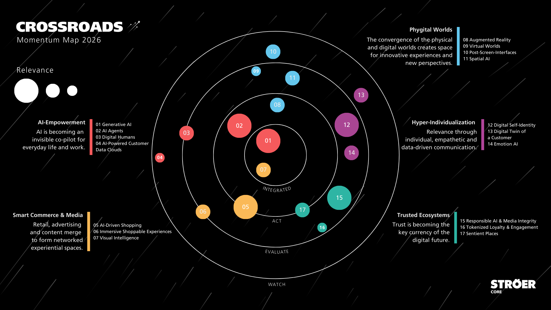 The Momentum Map depicts a total of seventeen signals. They show in detail how technologies, business models and communication logics are changing and where the greatest opportunities and challenges are emerging. From intelligent agents to immersive shopping experiences to emotional AI, one thing is clear: transformation is not a pipe dream, it has long been a reality.
