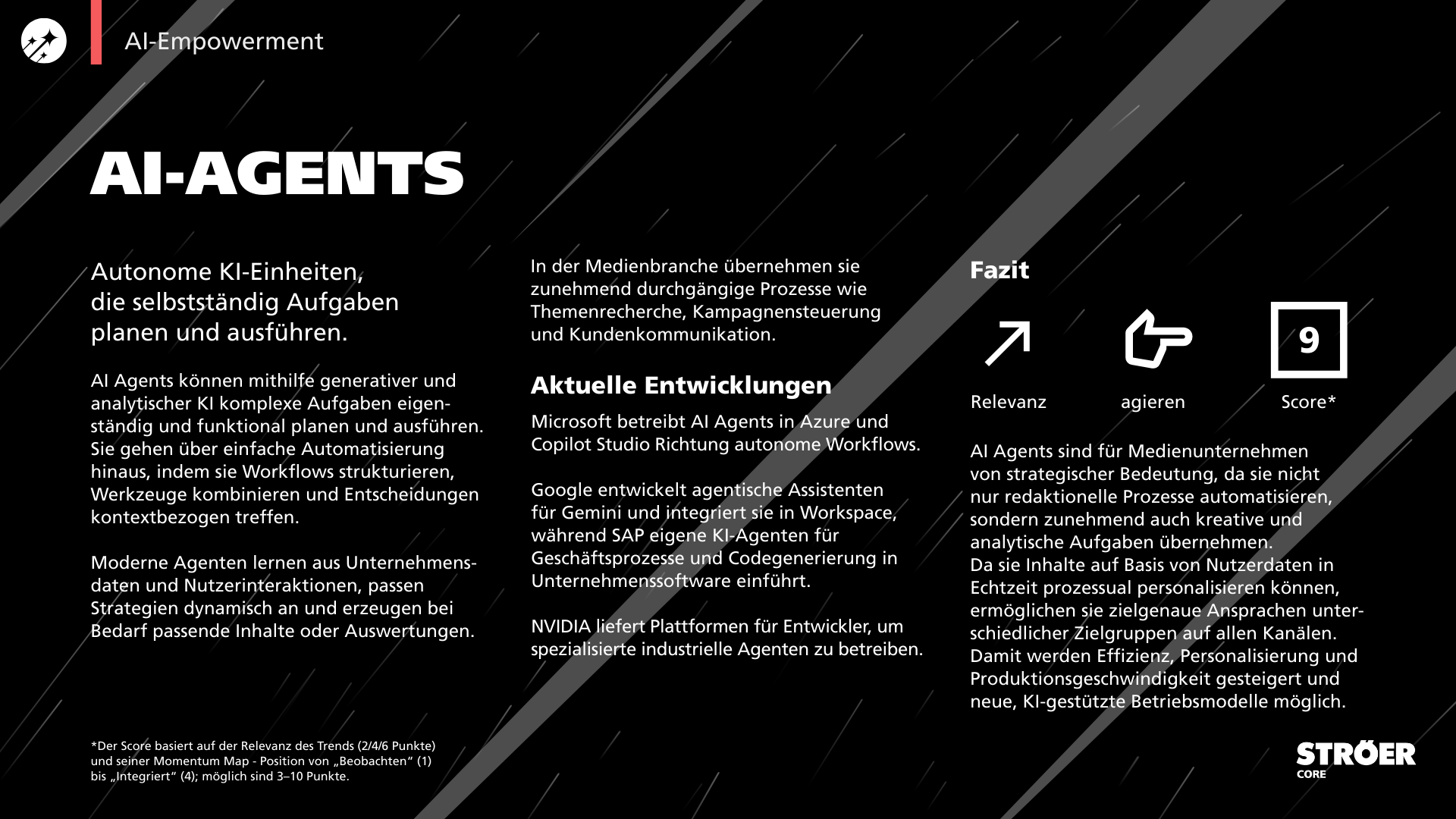 AI-Empowerment markiert somit nicht nur einen technologischen Trend, sondern einen Wendepunkt in der Beziehung zwischen Menschen, Marke und Maschine. Und genau darin liegt seine transformative Kraft. Entscheidend ist dabei nicht, ob Unternehmen KI einsetzen, sondern wie reif und strategisch sie dies tun. Während einige Anwendungsfelder noch beobachtet oder evaluiert werden sollten, sind andere, wie generative KI und AI Agents, längst im Modus der Integration angekommen. AI-Empowerment verlangt daher nicht nur technologische Kompetenz, sondern klare Priorisierung, Governance und den Mut, operative Verantwortung an intelligente Systeme zu übergeben.